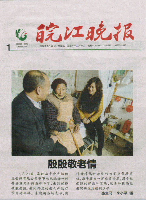 1月20日,馬鞍山市金太陽(yáng)物業(yè)管理有限公司董事長(zhǎng)朱曉梅一行帶著豬肉和鮮魚等年貨,來到姆橋敬老院,慰問那里的老人并致以節(jié)日的祝福。朱曉梅當(dāng)場(chǎng)表示,要將姆橋鎮(zhèn)敬老院作為定點(diǎn)幫扶單位,每年撥出 慈善專款,用于敬老院的建設(shè)和發(fā)展,改善和提高敬老院的生活福利水平。
