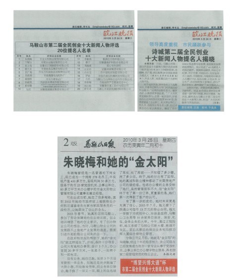 我公司朱曉梅總經(jīng)理成功進(jìn)入馬鞍山市第二屆全名創(chuàng)業(yè)十大新聞人物評(píng)選的前20名,此報(bào)道刊登于2010年3月24日的皖江晚報(bào),于此同時(shí)馬鞍山日?qǐng)?bào)也對(duì)我們的總…